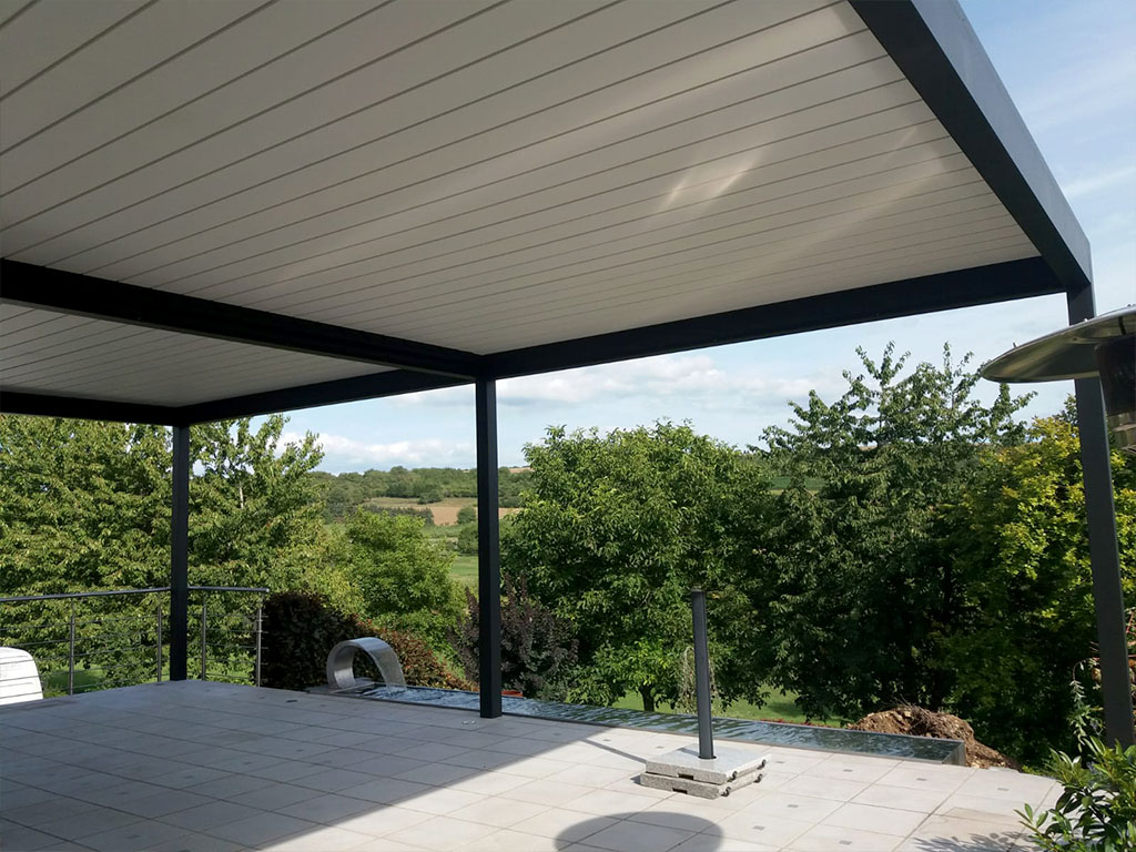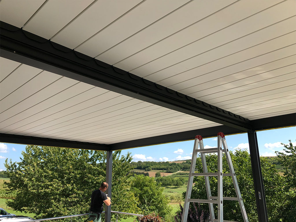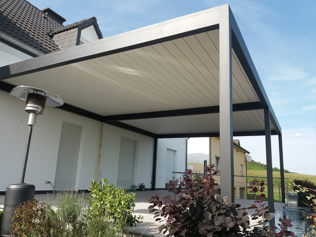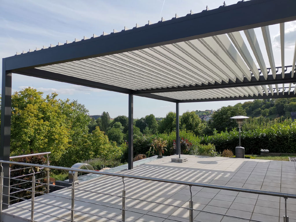 - Die drehbaren Lamellen des Daches schaffen eine robuste und bis zu 135° verstellbare Konstruktion, die vor Sonneneinstrahlung schützt, Helligkeit reguliert und eine natürliche Belüftung ermöglicht. Die versiegelten Lamellen widerstehen hohen Windlasten und schützen vor schwerem Regen und Schnee (bis zu 300 kg/m2 und 2,0 m).